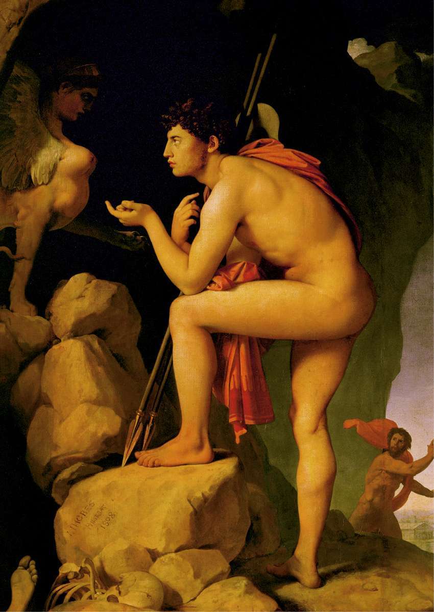 流浪者俄狄浦斯大智大勇,毅然前往,应对聪明严厉的女妖:“这是人。人在幼年,四肢爬行;壮年时期,两脚行走;而到了暮年,则需拐杖支持。”谜语被猜破,斯芬克斯又羞又恼,跳下悬崖摔死。她并不耍赖,何况这是神的裁判规则。不过,哲学家一样的妖怪如此消失,实在可惜。希腊悲剧诗人似乎很喜欢这个妖怪,称她为“精明的童贞女”。
