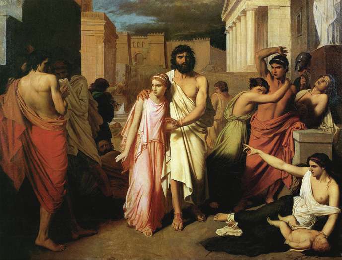 只有两个女儿(也是妹妹)同情并爱护父亲——这也恰好证明了弗洛伊德的“厄勒克特拉情结”(恋父情结)。次女伊斯墨涅留在家里管理他在忒拜的合法权益,长女安提戈涅则自愿与父亲一起流放。这位美丽高贵的公主,如今打着赤脚,衣衫褴褛,牵着盲人的手,日晒雨淋,四处漂泊,在别人的白眼中乞食。她分担着父亲的罪孽,给父亲以安慰。那种忠贞的品格和坚强的毅力即使在男性中都十分罕见。