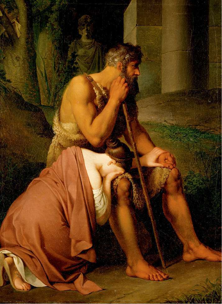 波吕尼刻斯果然不同于克瑞翁,他跪在父亲面前,抱着父亲的双腿,承认自己罪孽深重,希望父亲能宽恕。他还许诺,如果能夺回王权,仍然交给父亲执掌。尽管波吕尼刻斯情真意切,但俄狄浦斯毫不为之所动。他已经心如死灰,唯一的心愿就是净尽罪孽,安宁地死去。他送给波吕尼刻斯的,仍然是恶毒的诅咒:你们兄弟两个将倒在一片血泊中。