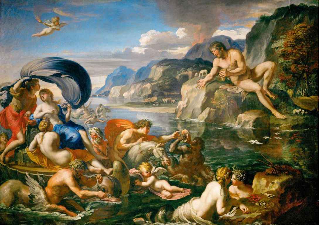 大海的君王波塞冬与自然女神托俄萨斯结合,生下了著名的巨人组合库克罗佩斯(有的神话认为库克罗佩斯是乌拉诺斯与盖亚之子,是为宙斯研制雷电的三人科研小组),库克罗佩斯中最著名的是波吕斐摩斯。这位巨人身材仿佛大山,毛发十分发达,神力自不待言,最有趣的是只生一只眼睛,又大又圆。波吕斐摩斯是化外之民,不受宙斯的管辖,在海岛上过着牧羊人的自在生活,有机会的时候也抓个人什么的塞到口中,希腊英雄奥德修斯的几个小伙伴就成了他的点心。不过,宙斯的化外之民却逃不脱爱情女神的控制。