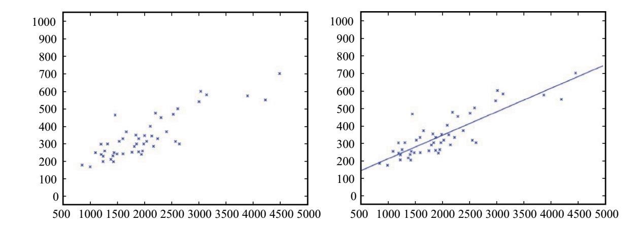 注:左图中分布的点可以用右图中y=ax+b形式的线性函数来近似表达。