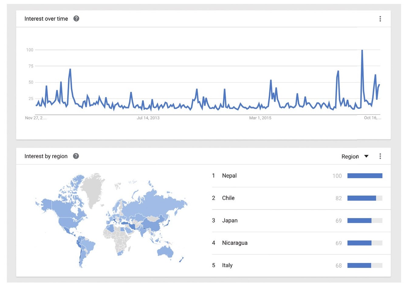 图30 利用谷歌趋势(Google Trends)分析全球近5年来的地震分布