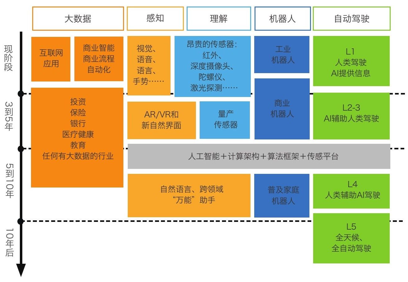 如图中所示,创新工场将人工智能领域的应用划分为大数据、感知、理解、机器人、自动驾驶等不同门类,每个门类中,按照人工智能技术的应用成熟度,将具体应用领域排列在时间维度上。