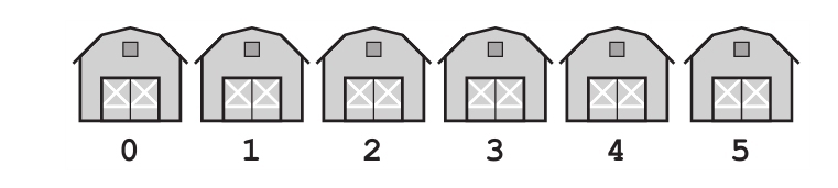 “但是我们现在可以做得更好。Crannock一家把六个谷仓排在了一条整齐的线上,就像是一个巨型数组。Crannock先生非常好心地为我们写好了谷仓的编号,也就是数组的索引,我们现在只需要走到对应的谷仓就行了。”