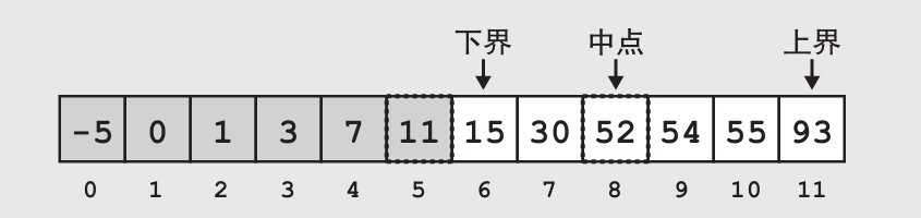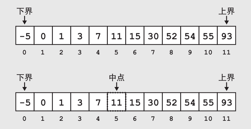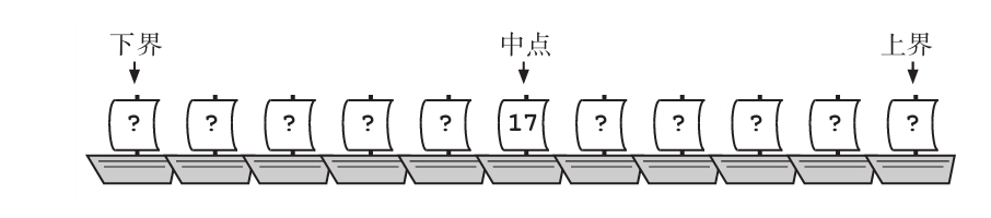 如果目标值不在数组中会发生什么呢?在搜索过程中,上下界之间的距离会越来越近,直到它们之间没有任何还未检查过的值。因为我们总是将其中一个界限移动到中间值的另一边,所以我们可以在IndexHigh<Indexlow的时候停下来,这个时候就可以保证目标值不在数组中了。