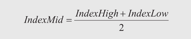 二分搜索算法的工作原理是:不断地将搜索空间分成两半,并且把搜索空间限制在其中的一半中。这个算法通过改变上下界限有效地限制了搜索空间。上界(IndexHigh)标记了搜索空间有效数组中最高的索引,下界(IndexLow)标记了搜索空间有效数组中最低的索引。通过这个算法,如果目标值在这个数组中,就可以保证: