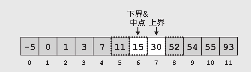第一个被判定的中点的值是11,比我们的目标值15小。因为我们知道这个数组是按照升序排列的,所以可以排除中点及其之前的所有部分。我们将下界索引移动到适当的地方(IndexLow=IndexMid+1)。