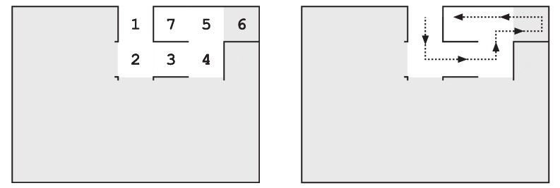 “现在我们就按顺时针的顺序开始吧。当我们有多个选择时,我们就按北→东→南→西的顺序来走,当然我们需要跳过之前已经走过的路。在每一个路口我们都按同样的顺序来选择方向,所以我们在能够向北走的时候总会优先向北走。不过现在,我们只有一个选择,那就是往南走。”