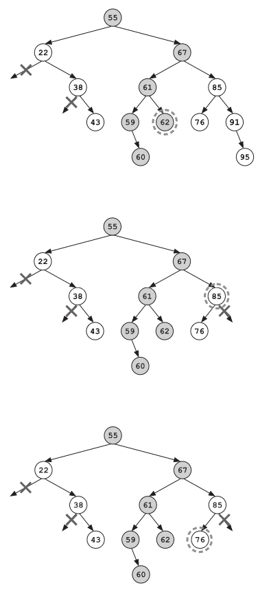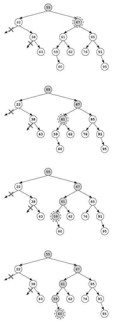 “现在的节点上显示的是22天,”Frank继续说道,“我们不需要将它放进结果列表。并且,因为所有在它左子树里面的值都会比22小,因此我们也不需要去检查它的左子树了。”