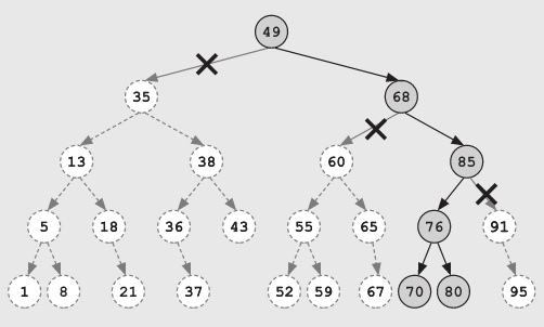 类似的,如果想找在区间[70,80]内的所有值,你只需要访问全部25个节点中的6个: