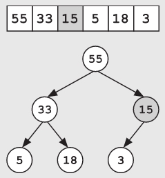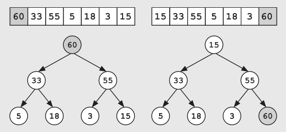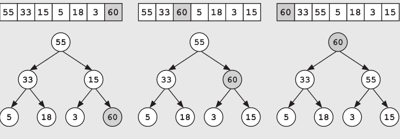 为了添加一个新元素,首先将新的元素添加到数组的最后面(即树底层中的第一个空白处)。如果新添加入节点的值大于其父节点的值,这将破坏堆特性,因此需要将此节点向上移动,直到它不再大于其父节点的值,并重新恢复堆的特性。也就是说,如果新加入节点的值大于其父节点的值,就不断地将该节点的值与其父节点的值进行交换。例如,如果要将60这个数添加到前面的堆中,则首先将它插入底部,然后将其向上移动,进行两次与上一级节点的交换操作。因为第一次在与15交换后,该节点的值仍然大于其新的父节点55,所以还需要再与55交换一次。