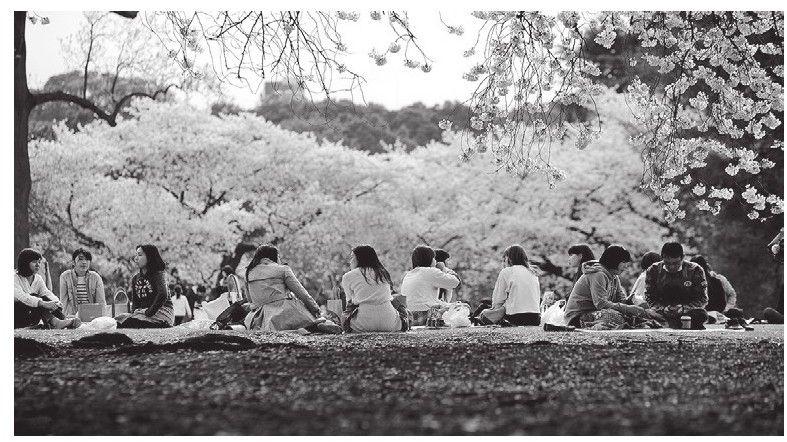 在春天樱花盛开的时候,日本民众都喜欢带上亲属,邀上友人,携酒带肴在樱花树下席地而坐,一边赏花,一边吃喝玩乐闹,甚至还唱卡拉OK。