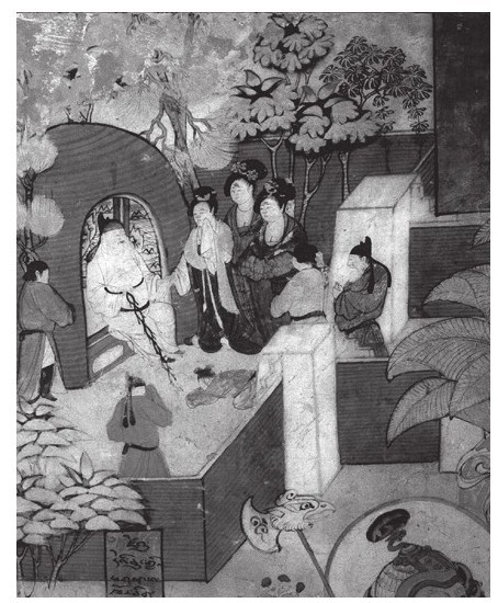 敦煌壁画《老人入墓图》反映了唐朝时期敦煌地区人民的佛教思想。这不是为去世的人举行葬礼,而是一位感到死期将至的老人来到坟墓前与亲人诀别,然后独自进入墓室与外界断绝往来直至去世。墓室里面装修成了佛堂的样子,老人希望自己可以在生命的最后时刻诵经念佛,在安心修持中离开今生。