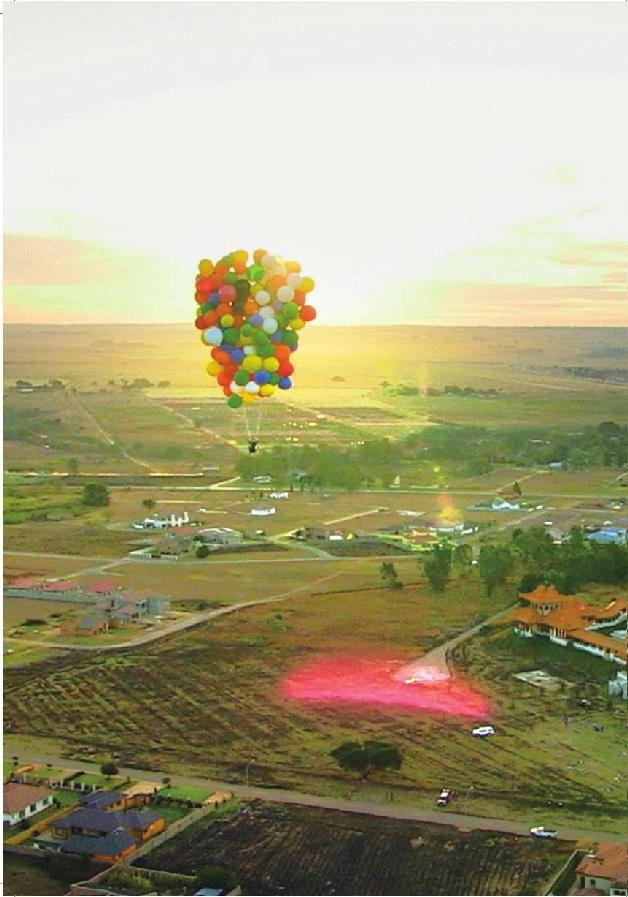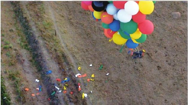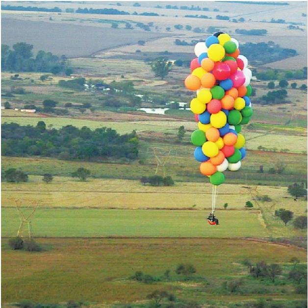 高度计“嘀嘀嘀”地开始报警,把我从如梦如幻的感觉中拉回现实。我割断几根绳子,果然,因为等待的时候绳子缠绕在一起了,只有少数几个气球脱群,奔向更高的天空,而我还在继续上升,高速前进。我只得掏出枪,再打掉外围的几个气球。几声爆响,我终于达到了中性浮力。