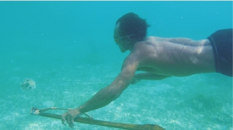 尹吉尔的女婿下好网,戴上自制的潜水镜,拿着鱼枪就跳下去了。裸潜,没有任何设备,他在深海里顺着渔网,驱赶着鱼群,时不时地钉几条大鱼上来。