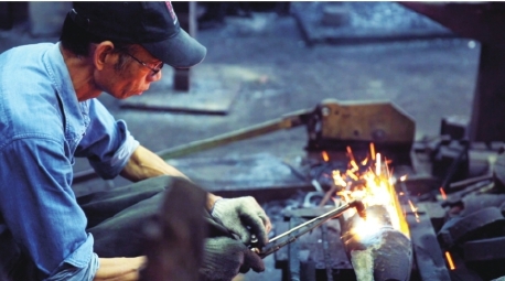 用切割机时,看到我的手竟然异常平稳,一旁的吴老啧啧赞叹,我开始有点儿自鸣得意了。但在锻打刀具的过程中,我还是出糗了,不管怎么敲,刀把就是越来越歪;一旁的吴老指点道,锤子要往刀口的位置打。