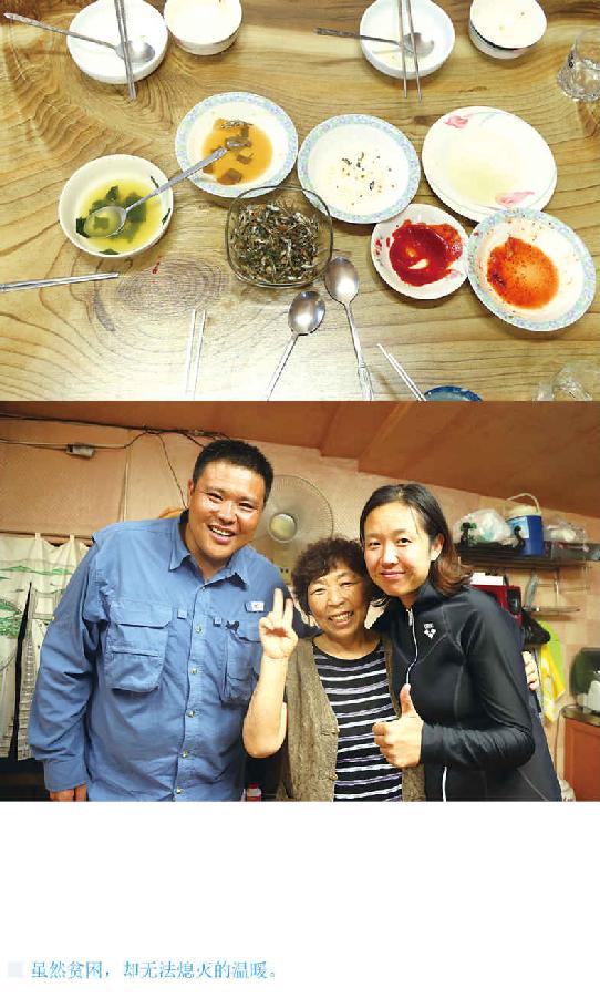 金阿姨给我们做了一桌“丰盛”的午餐:三盘泡菜,三碗海胆汤,一盘海螺——海胆汤和海螺是为我们准备的,甚至金阿姨都没有准备自己和丈夫的分量。金阿姨说,平时他们自己的菜谱,就只有泡菜。这些东西她们天天打捞,但是自己却舍不得吃,要换钱,补贴家用。