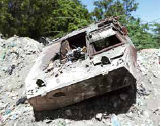 听到这儿,我似乎想起了什么,扭头四处看,这里一共有三个这样的“垃圾箱”。我知道它们是什么,虽然其表皮上的“UN”字样,已经被时间、阳光和风沙给抹掉了——是的它们是美军三角洲特种部队和联合国部队遗留在这里的轮式装甲车。索马里民兵在当年“摩加迪沙之战”中缴获的战利品。