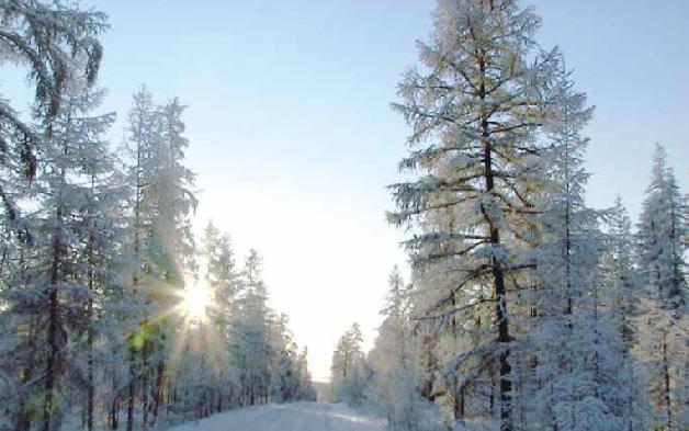 终于,奥伊米亚康的标志性建筑——零下71.2℃纪念碑出现在了我们眼前,迎接我们的到来。后面原野里、山丘上林立着许多房屋。房顶都被白色的雪覆盖,不怕冷的树的绿色也全都屈服了,装点上了雪。