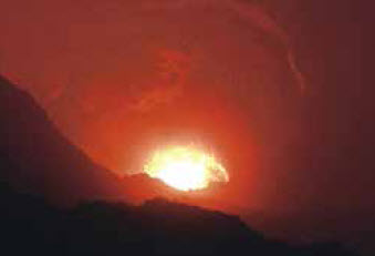 老天爷似乎听见了我们的抱怨,风起,雾散。火山的轮廓渐渐显露出来,几分钟之后,马鲁姆终于露出了它的真容。不得不佩服大自然的鬼斧神工,此景只应天上有:熔岩翻滚,炽焰沸腾,鲜红耀眼,仿佛太阳的一块,脱落在了这里。