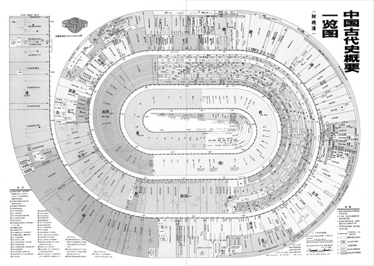 商朝和周朝紧随其后,完成了外面的一圈。螺旋形状的图表每转一圈就变大了一点,像是在不断加速之中。每到一段历史的终结,例如一个朝代、一段战乱时期,图表上就会出现一条标志线和一个黑色的“X”,随后由其他全新的事件取而代之。这个螺旋形图表没有分支,也没有终点。螺旋形图表转了三个大圈,才从元谋人走到了1911年的辛亥革命,这里时间轴终于打破了圆圈,伸展开来,指向图表的上方,并最终消失。