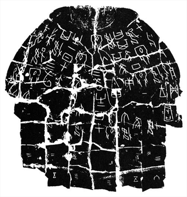 现在,有很多历史学家认为,这个关于疟疾的故事是不可信的,对于重新发现甲骨文的确切日期,他们也是争论不休。不过,王懿荣是第一个正儿八经地收集刻字龟壳的人,这点是毫无争议的。他也确实是在北京的药铺里买到那些龟壳的——那时还叫做“龙骨”。学者此时开始管它们叫“甲骨文”,意为“刻在龟壳和骨头上面的文字”。