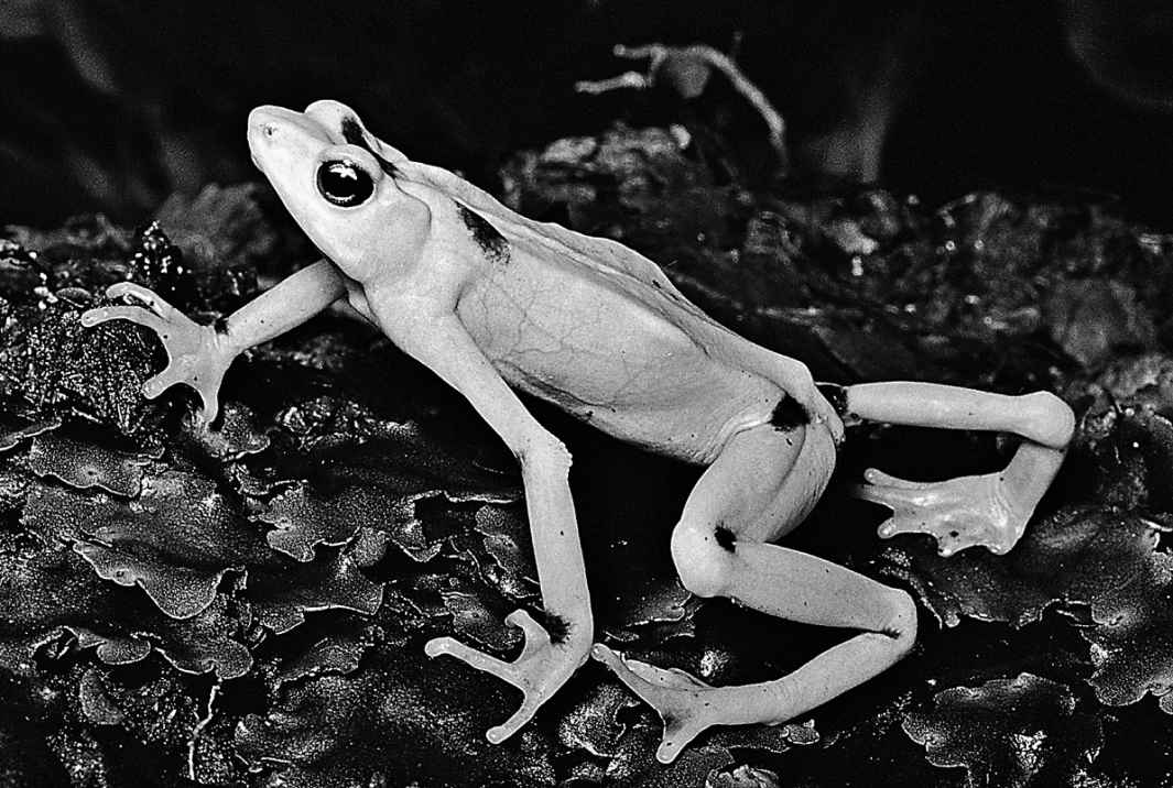 我第一次到访EVACC的时候,格里菲思带我参观了那些已在野外灭绝的物种仅存的代表。除了巴拿马金蛙之外,还包括2005年才刚刚发现的拉氏缨肢树蛙[7]。我到EVACC的时候,那里只剩下一只拉氏树蛙了,也就意味着像挪亚那样保留一对雌雄个体以繁育后代的可能性显然已经没有了。这种树蛙的皮肤是微微发绿的棕色,带有黄色的斑点。它们大概有10厘米长,脚大得不成比例,这让它们看起来就像是笨拙的大孩子。拉氏缨肢树蛙生活在比埃尔巴耶镇海拔更高的森林里,卵就产在树洞中。这种树蛙的雄性养育孩子的方式非常与众不同,甚至可能是独一无二的:它们会让年幼的蝌蚪啃食自己背部的皮肤。格里菲思说,他觉得在EVACC最初的紧急收集行动中,可能有许多其他的两栖物种被遗漏了,结果就此灭绝。具体的数字很难说,因为它们之中大多数很可能都是科学界所未知的。“太惨了,”他告诉我,“我们甚至还不知道这些两栖动物的存在,就已经失去了它们。”