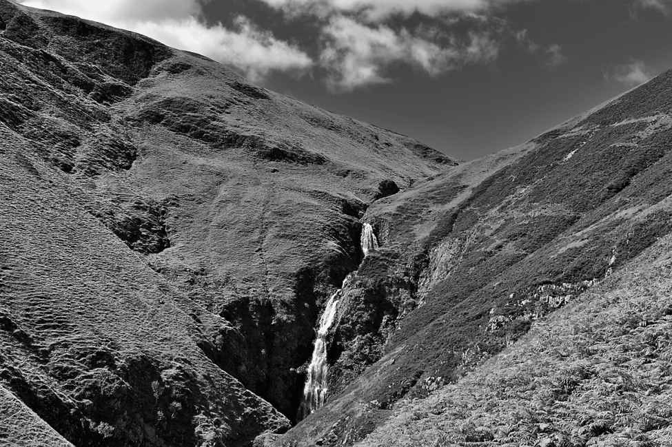 小路顺山势而上,越过一道湍急的溪流,又从相反的方向再次越过同一道溪流。路旁有一只绵羊的尸体,死去多时,已经干瘪得像个废弃的气球。这座小山绿得发亮,却几乎没什么树。那只死羊的祖祖辈辈们确保山上不会有任何东西长得比它们嘴的位置还高。在我看来,天上是在下雨。不过,这里可是苏格兰的南部高地。一位与我一同远足的地质学家告诉我,这只能算是很小的毛毛雨,苏格兰语称之为“浓雾”(smirr)。
