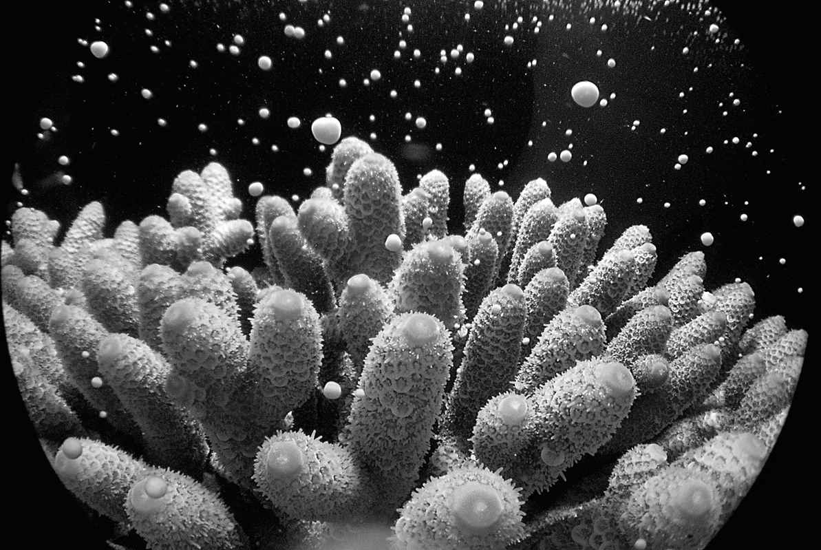 珊瑚的集体排卵总是发生在日落以后。夜色渐深之际,珊瑚就开始排卵排精了,这或许可以看作硬化目动物的产前阵痛。裹着卵子和精子的小囊开始从珊瑚虫的躯体上膨出,整个珊瑚群落看起来就像是一片鸡皮疙瘩。在苍鹭岛上,一些澳大利亚研究人员已经建立了精巧的“产房”,让他们可以研究这一现象。他们事先采集了大堡礁上最常见的一些珊瑚物种,其中就包括多孔鹿角珊瑚(Acropora millepora)。一位参与项目的科学家告诉我,多孔鹿角珊瑚在珊瑚研究中的功能就相当于“实验室里的小白鼠”,因此常常会被饲养在水箱中。多孔鹿角珊瑚群落构建的珊瑚礁看起来就像是一丛微型的圣诞树。携带手电筒靠近养珊瑚的水箱是被禁止的行为,以防扰乱珊瑚体内的生物钟。不过大家都戴着特殊的红光头灯。我借了一顶头灯戴上,这才看到珊瑚虫透明躯体中紧绷的卵精囊泡。这些小囊泡是粉红色的,看起来就像是小小的玻璃珠子。
