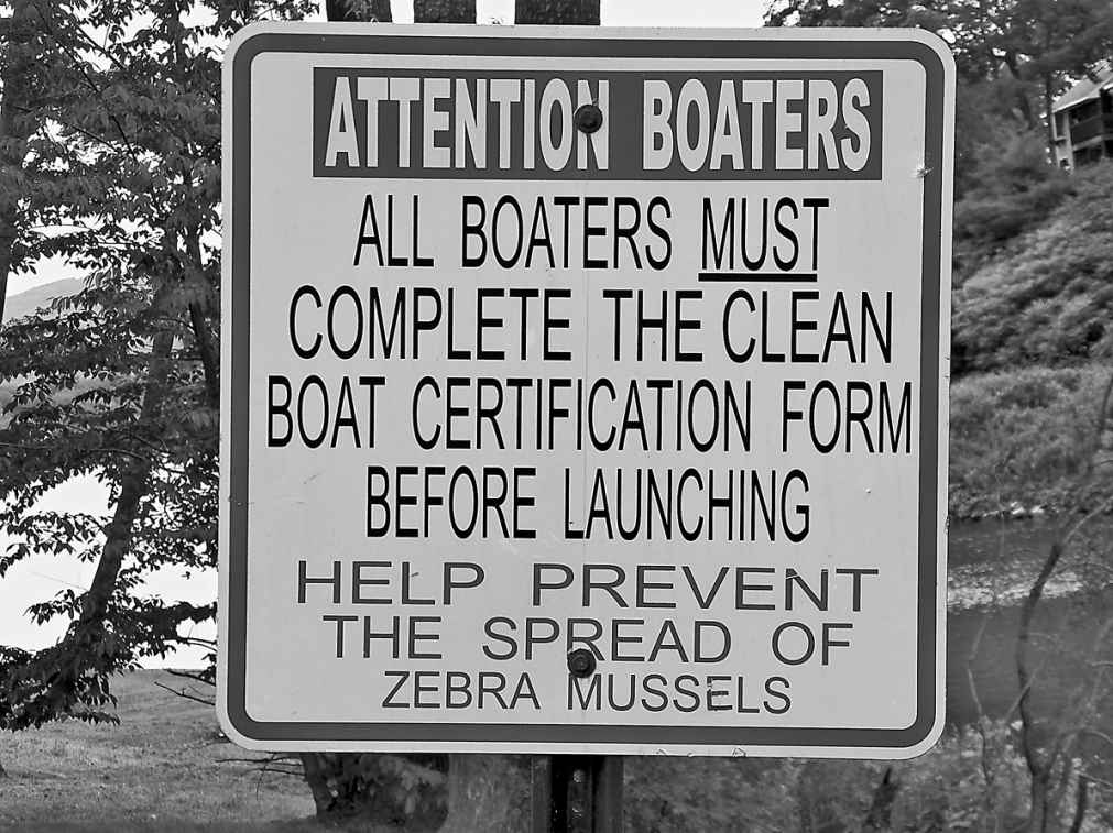 从我住的地方沿着路向低处走有个湖,湖边立着的一块牌子上写着:“禁止水中顺风车!清洁所有娱乐设施!”牌子上画着一艘船,上面覆满了斑马壳菜蛤,看起来就好像是有人误把这种软体动物当成油漆来用。