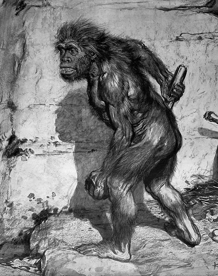 既是人类又不是人类,尼安德特人明显成了我们的一面可以比照的镜子。自《人类的由来》之后,又有大量的著作反映了尼安德特人与人类之间的尴尬关系。1908年,在法国南部的圣沙拜尔(Chapelle-aux-saints)镇附近的一个洞穴中发现了一具近乎完整的骨架。它最终来到法国国家自然历史博物馆的古生物学家马塞兰·布勒手中。在一系列著作中,布勒发明了或许可以称之为“不要太尼安德特”的尼安德特人形象:弯曲的双膝,驼起的背部,野蛮的外表。[5]布勒写道:尼安德特人的骨骼显示了“明确的类人猿骨架特征”,他们的头骨形状表明“纯粹的植物性或动物性神经功能占据了主要地位”。[6]据布勒的观点,“能够感知艺术或宗教”的发明创造力以及抽象思维的能力显然超越了这种浓眉生物的大脑功能。许多与布勒同时代的学者研究了他的结论之后,都表达了赞同的意见。例如英国的人类学家格拉夫顿·埃利奥特·史密斯爵士(Sir Grafton Elliot Smith)把尼安德特人的行走姿态描述为“半弯着身子懒散地坐在奇怪而毫不优雅的两条腿上”。(史密斯还宣称,尼安德特人“覆盖全身的粗重毛发更加令他们不具吸引力”。不过,从那时候一直到现在都没有任何实际证据说明他们身上长满了毛。)