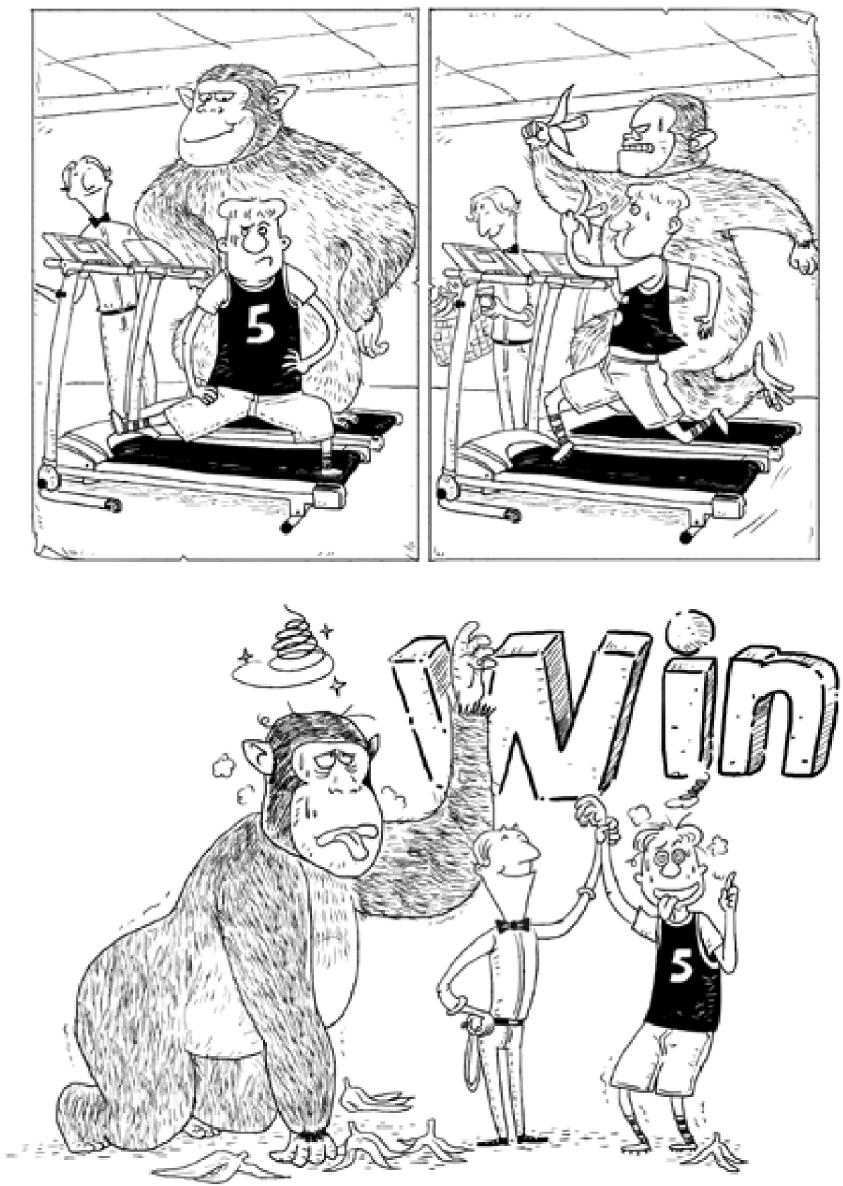 ▲ 黑猩猩与人在跑步机上赛跑,在相同运动距离的情况下,人类消耗的能量只是黑猩猩的1/4左右。也就是说,当黑猩猩需要吃四根香蕉时,人类只吃一根就够了……