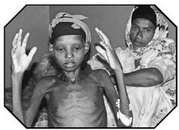 在埃塞俄比亚南部食物紧急救助站的一个13岁女孩。她的母亲扎赫拉(右)说,家里的男性都营养良好。站里的几十个孩子里,几乎全是女孩,这也反映出在食物紧缺时父母总会优先照顾男孩的现实。由这种性别歧视导致的区别对待,使得全球每年大约有200万名女孩丧生。