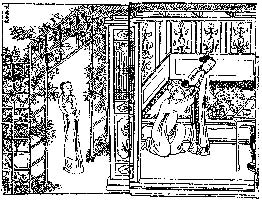 张君瑞跪倒在崔莺莺面前,丫环红娘在外窃笑。(选自《北西厢记》插图,明王耕画,万历年间玩虎轩刻本,现藏安徽省博物馆。)