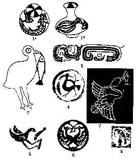 几种鸟鱼纹结合的图案1.宝鸡北首岭出土的细颈彩陶壶上鸟啄鱼纹样;2.临汝阎村出土的彩陶缸上鸟衔鱼图;3.西周青铜器上的鸟鱼纹;4.秦汉瓦当上的鸟衔鱼纹;5.汉代画像石上的鸟啄鱼纹;6.晋代金饰品上的鸟衔鱼纹样;7.明代织锦上的鸟衔鱼纹样;8.明代砖刻上的鸟衔鱼纹样。