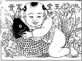 山东平度的民间版画,图中鱼和莲子都是生殖象征,该画意味着多子多福,富贵有余。