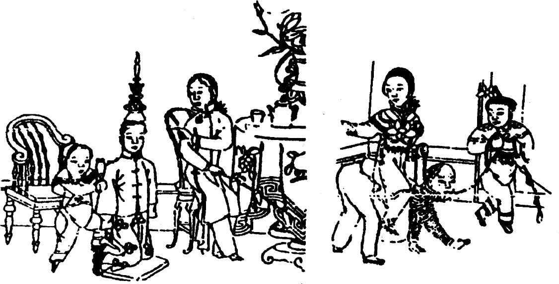 河北武强民间木刻版画《怕老婆图》中的“顶灯叫亲娘”和“驼妻唱赶脚”。