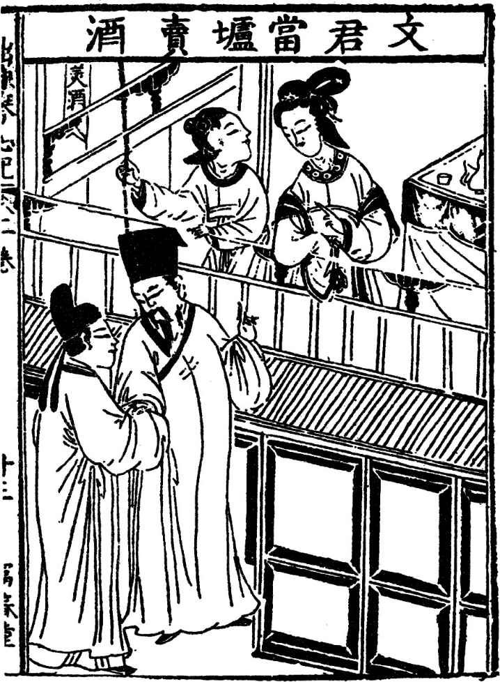 卓文君与司马相如私奔后,又跑回临邛,亲坐柜台,当垆卖酒,让老爹卓王孙大丢面子。(选自《琴心记》插图,明万历金陵富春堂唐氏刻本。)