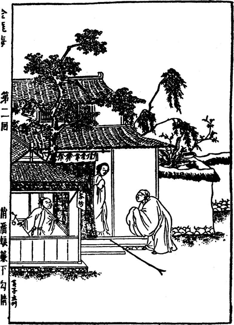 西门庆潘金莲由王婆牵线勾搭成奸。(选自《金瓶梅》插图,明崇祯年间刻本,刘应祖等镌刻。)
