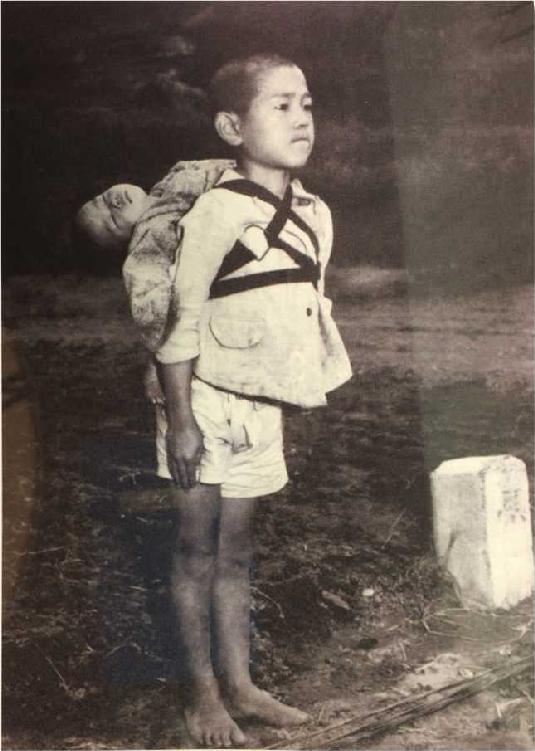 我看见这个大概十岁大的男孩走过来。他背着一个小弟弟。在日本常看见大一点的孩子背着幼小弟妹一起玩,但是这个男孩不太一样。他很严肃。没穿鞋,表情僵硬。背着的小婴儿的头垂向一边,好像睡着了。