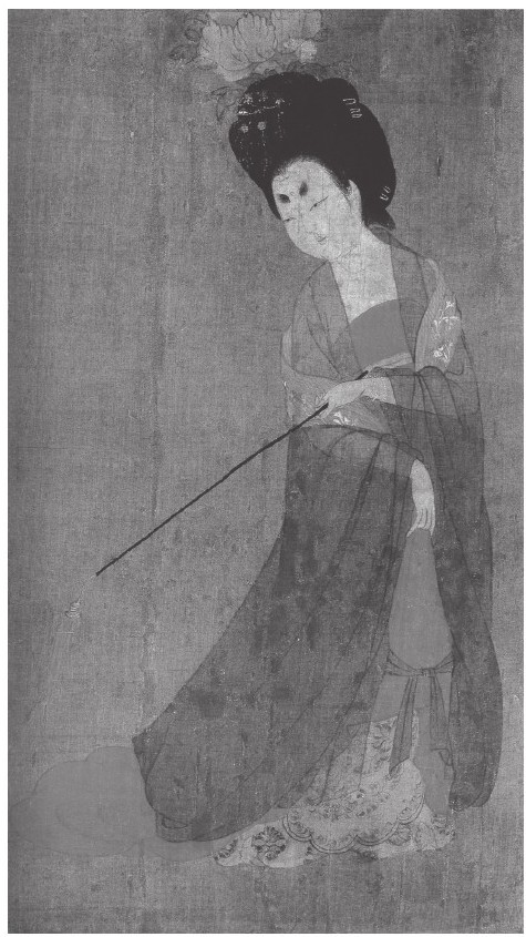 《簪花仕女图》为唐代画家周昉所绘,是典型的唐代仕女画作。画中展现唐代贵族女性的日常生活,分“戏犬”、“慢步”、“看花”、“采花”四个情节。此局部是图卷最右部分,一位身披紫色纱衫的贵妇,手执拂尘侧身转首逗着一只摇尾吐舌的小狗。人物形象丰腴,神态安闲。反映出那个时代对女性的审美观——雍容华贵、丰腴端庄。