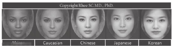 韩国整形医学教授李承哲通过对世界各国63名漂亮女艺人脸形的分析,用电脑合成出一份“标准美女脸”。中国美女脸形采用了演员巩俐、汤唯、章子怡等人作为参照。从左至右分别为黑人美女、白人美女、中国美女、日本美女和韩国美女。