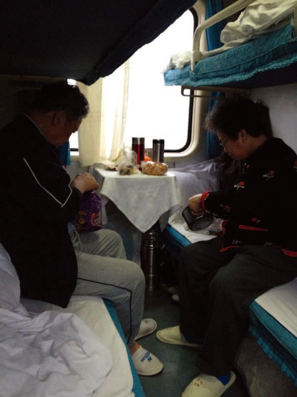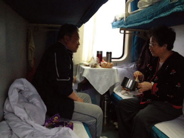 清早醒来,车厢还很安静,吃过泡面,扳下过道座位坐着,一个老太太用不锈钢碗打了热水,泡两双筷子,洗净后插在零食袋。她穿宾馆一次性拖鞋,走路很慢,有点胖,但不臃肿,蓝色袜子,灰色棉长裤,绣了梅花的红边针织衫,看起来气色很好,平和得体。她在碗里泡面,老爷子揭开午餐肉盖子,用筷子划成四方的肉挑进面里。老爷子先吃,老太太依窗躺下看着他。吃完,老爷子又起身泡一碗面回来,帮婆婆添点小菜。两位话不多,偶尔说两句,声音也很低。我取下耳机,听他们口音,是北方人。我才起来时,用刷牙的陶瓷碗泡面吃,以后又洗了新鲜枣子放在里面,做这些事时,身体里像是有一种微妙的节奏。车上只有我们用碗泡面,因为这一点共通之处,心里莫名觉得欢喜。在衡阳,老爷子下火车抽烟,隔着车窗朝我挥手,让我告诉婆婆他就在下面。婆婆对我笑,说声谢谢。两位从包头出发,先在湛江看儿子,如今去北京和女儿一起过年。