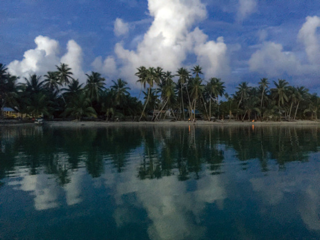 那天下了货船,接驳船带我们穿过潟湖上岸,我觉得一切美得不真实,觉得自己何德何能,可以见到这样的美景。两个岛之间,一线长的潟湖,中间稍微高一点的石头上长出几棵椰子树,像是凭空悬在地平线上。潟湖的水清澈见底,手伸下去,还留着日光的温度,很舒服,几个人站在潟湖边缘甩钓,你知道,潟湖边缘就是几千米深的大洋。接驳船越往岸边走,水越平静,到最后平静得像面镜子。天色渐暗,天地间剩下一点幽暗的蓝色,岸上有火光,小孩子们扎堆站在岸边等船靠岸。那样的场景,有点像进入桃花源境一般。