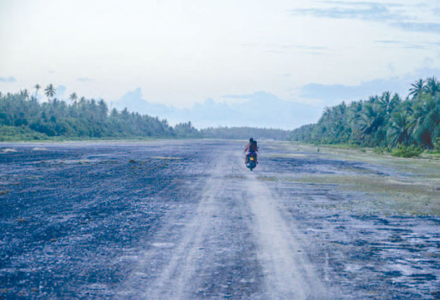 远远望见陆地,彭林岛到了。和谷歌地图上看到的卫星图一样,两溜窄的陆地,中间围了潟湖。飞机转弯,眼前一条坑坑洼洼的跑道,不少人在跑道尽头的亭里迎接,给下来的乘客戴上两串很大的鸡蛋花花环。飞机并不多做停留,加完油就走,这时大家在亭里唱歌,一是欢迎乘客的到来,二是欢送即将搭飞机去拉罗汤加的亲人朋友。这样的送别仪式在每个岛都有,除了唱歌,还有牧师祈祷。