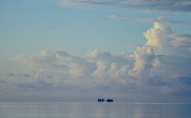 这一飞就是三个小时,烈日灼灼,我再也无法靠着窗户睡了,换了很多个不舒服的姿势,只见飞行员用遮阳布拦在前方,看看报纸,感觉飞机并不难开。睡睡停停,还没有到,从窗户往下看,飞机飞得不算高,看得见海水起起伏伏的轮廓,只是一动不动,有时看着远方的云,像极了潟湖外涌起的海浪,于是地上一片海,天上一片海,让人分不清虚实。飞机有时从两团巨大的白云之间飞过,前方豁然开朗,眼睛盯着海面,心想要是能看见我们的渔船就好了。