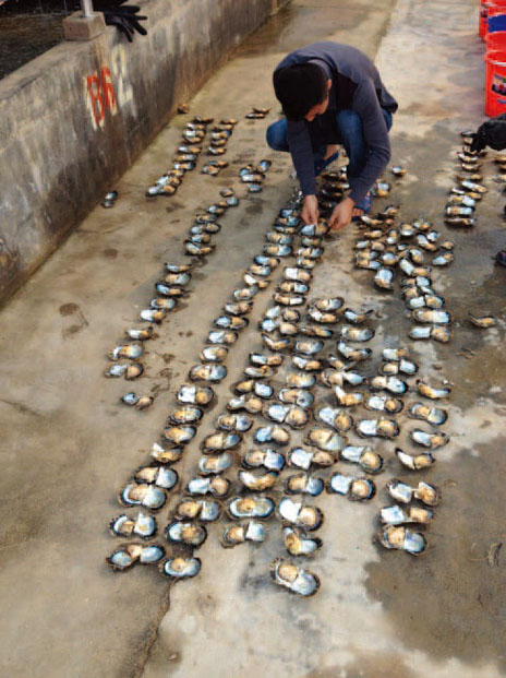 根据内壳色配对。培藻用作贝苗的饵料。挑来做亲本的红贝——华贵栉孔扇贝。