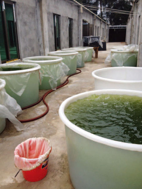 接下来该投饵料了,饵料是师兄培育的扁藻。其实金藻最适合做开口料,足够小,且消化吸收率高,但坏就坏在做大池培养时难以成为优势种,相比起来扁藻则容易得多。