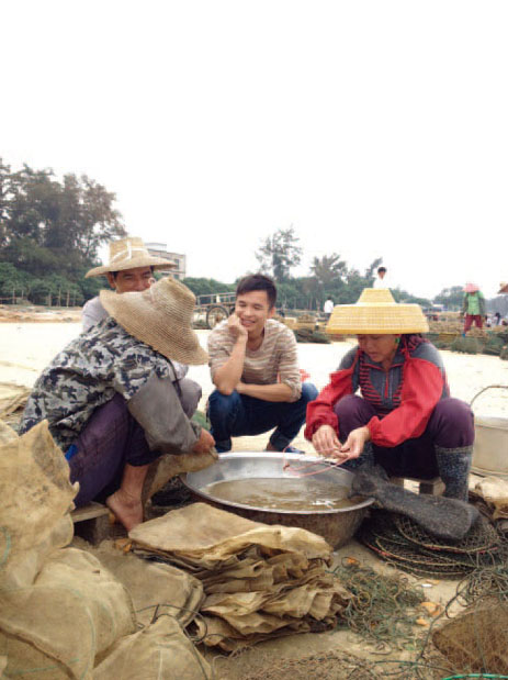散步后在虾塘边上坐坐。即将运往湛江的白贝——墨西哥湾扇贝。师兄和养殖户聊天。