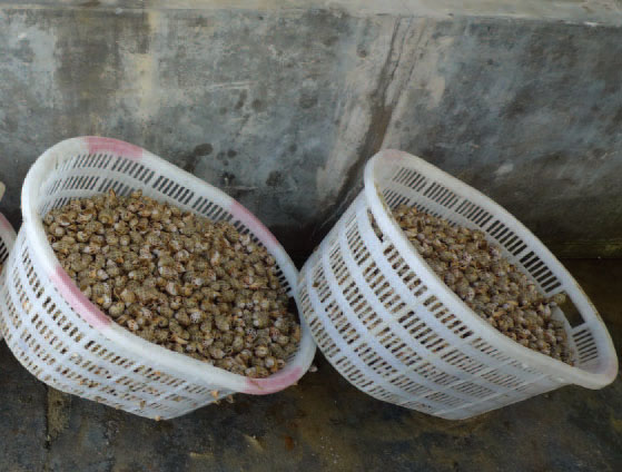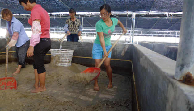 到年底,师姐养的螺一斤五六十只,可以卖了。早上听见师姐敲门,喊我们几个起来帮忙。真是太早了,太阳还没爬上木麻黄呢。到养殖池,大家各自分工,铁锹将沙铲进箩筐,另外有人拿水管冲,沙随水流下去,剩下干净整齐的螺在筐里。事情单调乏味,但有的池里混养着斑节对虾,蓝色的尾巴和爪子,看起来又肥又好吃。我请师姐慢慢铲,担心一锹下去拦腰铲断它们。看到虾在蹦,我把水管交给旁边人,抓起虾便往藻池跑,攒在那里,夜里可以加餐呀。有意外收获,做事就有劲了。